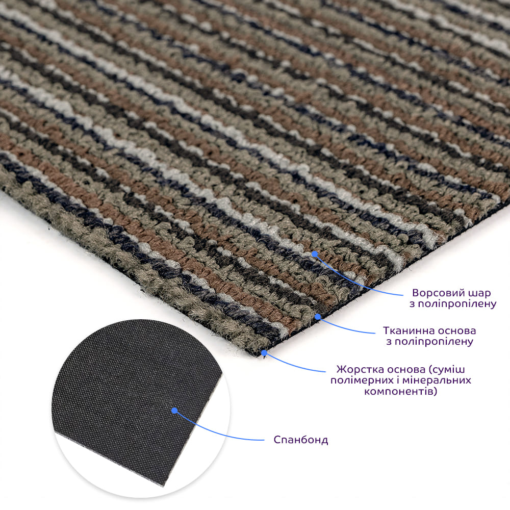 Верхний слой определяет внешний вид покрытия и ощущения при ходьбе. Полипропиленовые (PP) волокна сохраняют форму, не впитывают влагу, устойчивы к истиранию и электризации, легко очищаются. Густота и высота ворса напрямую влияют на долговечность покрытия, поскольку именно этот слой принимает основную нагрузку при эксплуатации.
