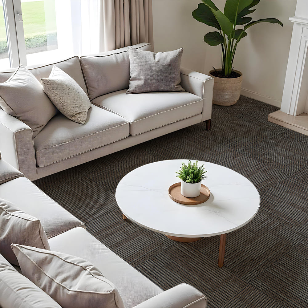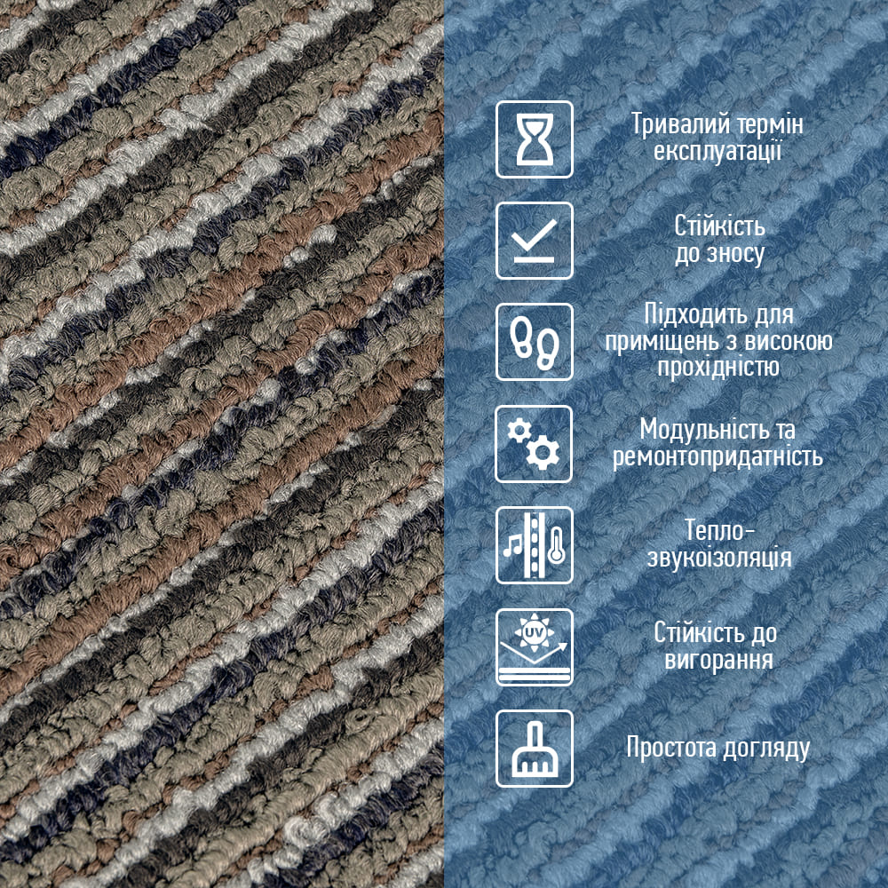 Ковролин в плитках — это современное модульное напольное покрытие, состоящее из отдельных квадратных элементов. Плитки легко монтируются за счёт собственного веса или фиксируются клеевым составом. Благодаря высокой плотности ворса материал отличается повышенной износостойкостью, устойчивостью к влаге и механическим нагрузкам. Такое покрытие подходит как для небольших помещений, так и для масштабных площадей с высокой проходимостью: офисов, коридоров, холлов, торговых зон и жилых комнат.