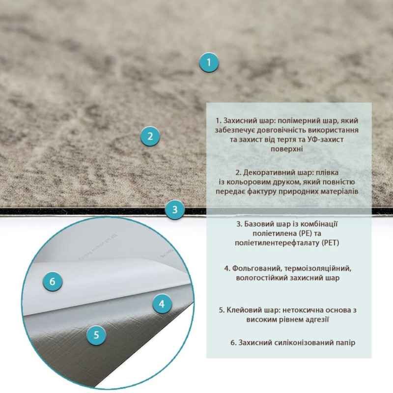 Каждая виниловая плитка создана по продуманной технологии, где каждый слой выполняет свою важную функцию — от защиты до эстетики. Такая конструкция обеспечивает долговечность, стойкость к износу и привлекательный внешний вид на долгие годы.