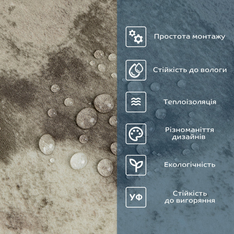 Прочный и упругий полимер обеспечивает устойчивость плитки к ударам, влаге и бытовой химии. Благодаря своей структуре материал легкий, эластичный и долговечный, что делает монтаж простым и комфортным.
