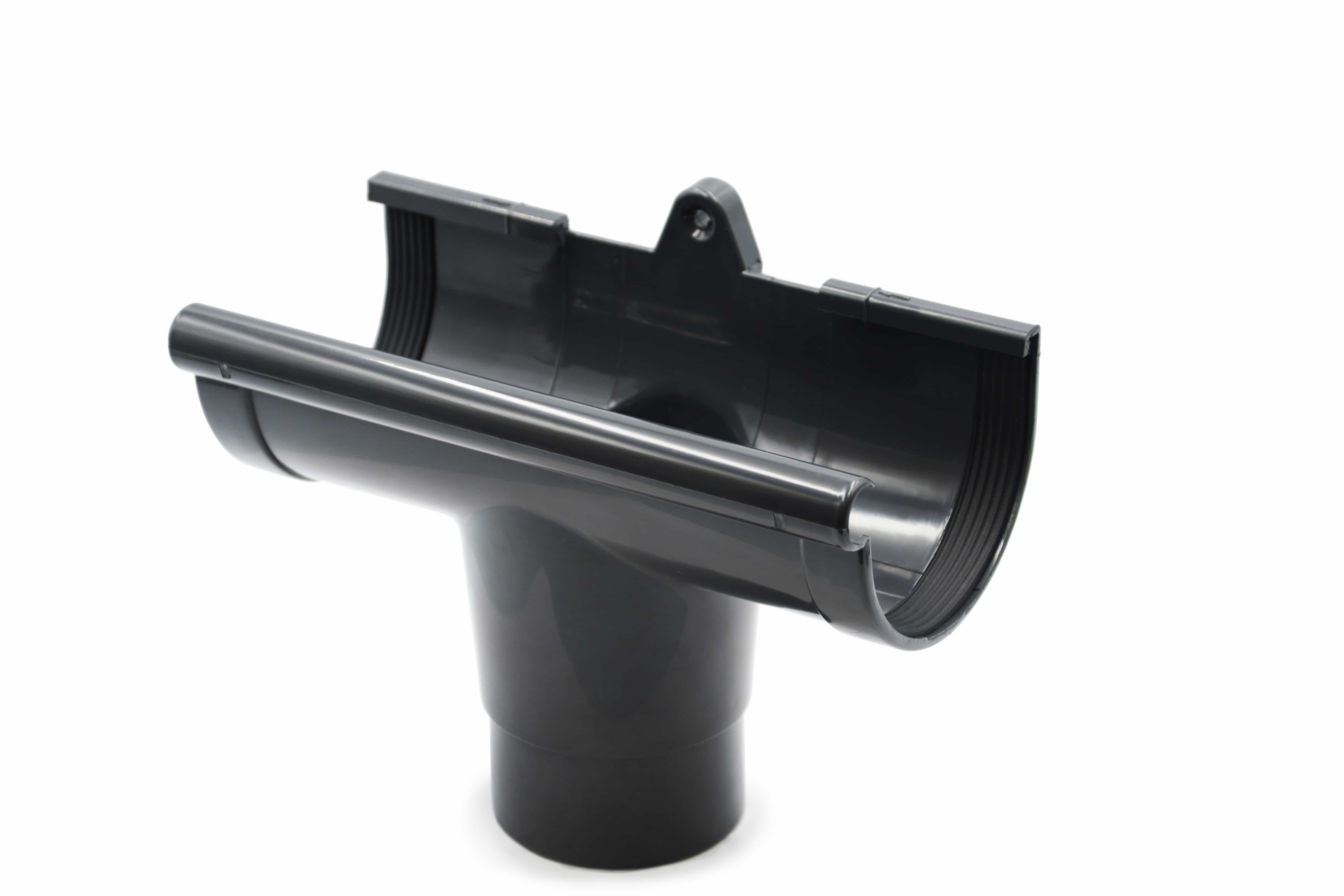 Воронка предназначена для соединения желобов и труб с целью отвода дождевой и талой воды с поверхностей крыш в водосливную систему. Она состоит из двух частей: водосточной муфты (радиус 90 мм) и цилиндрической трубы (диаметр 75 мм), которая соединена с муфтой под углом 90 градусов. Чтобы обеспечить герметичность соединения, используется уплотнитель, сделанный из жесткого PVC U. Изготавливается воронка методом литья, а уплотнитель изготовлен из закрытопористого каучука EPDM.